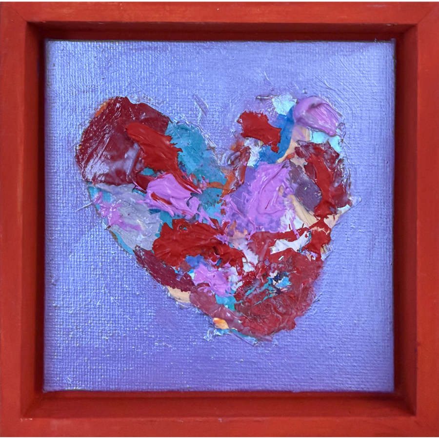Acrylic scraps on canvas panel, framed, with wooden easel. Frame face: 1/4 in.