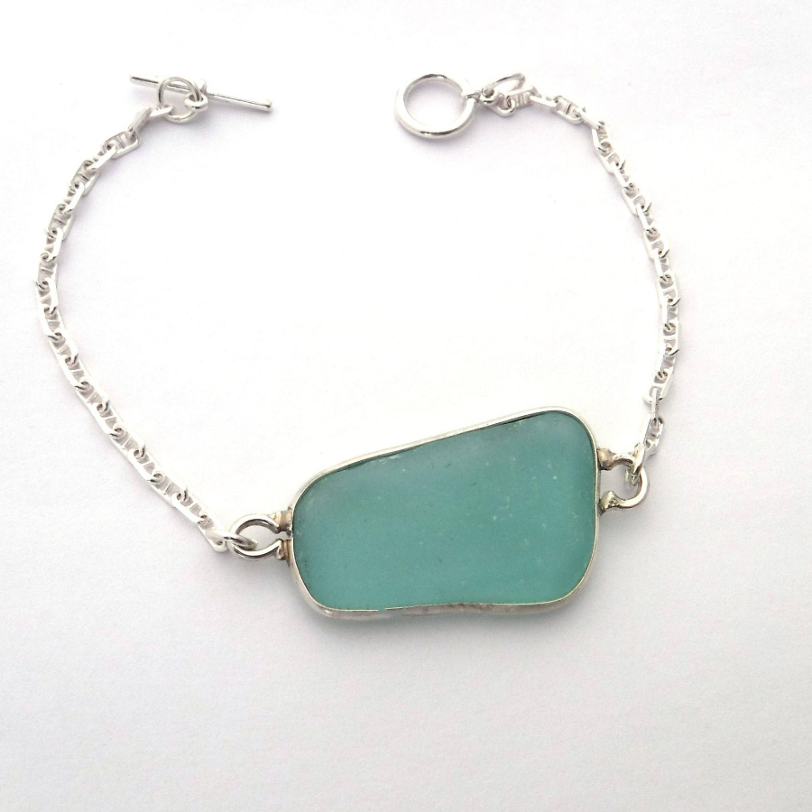 Seaglass, Sterling silver bezel, anchor chain, and toggle clasp. 7 1/2 X 1/4 X 3/4 in.
