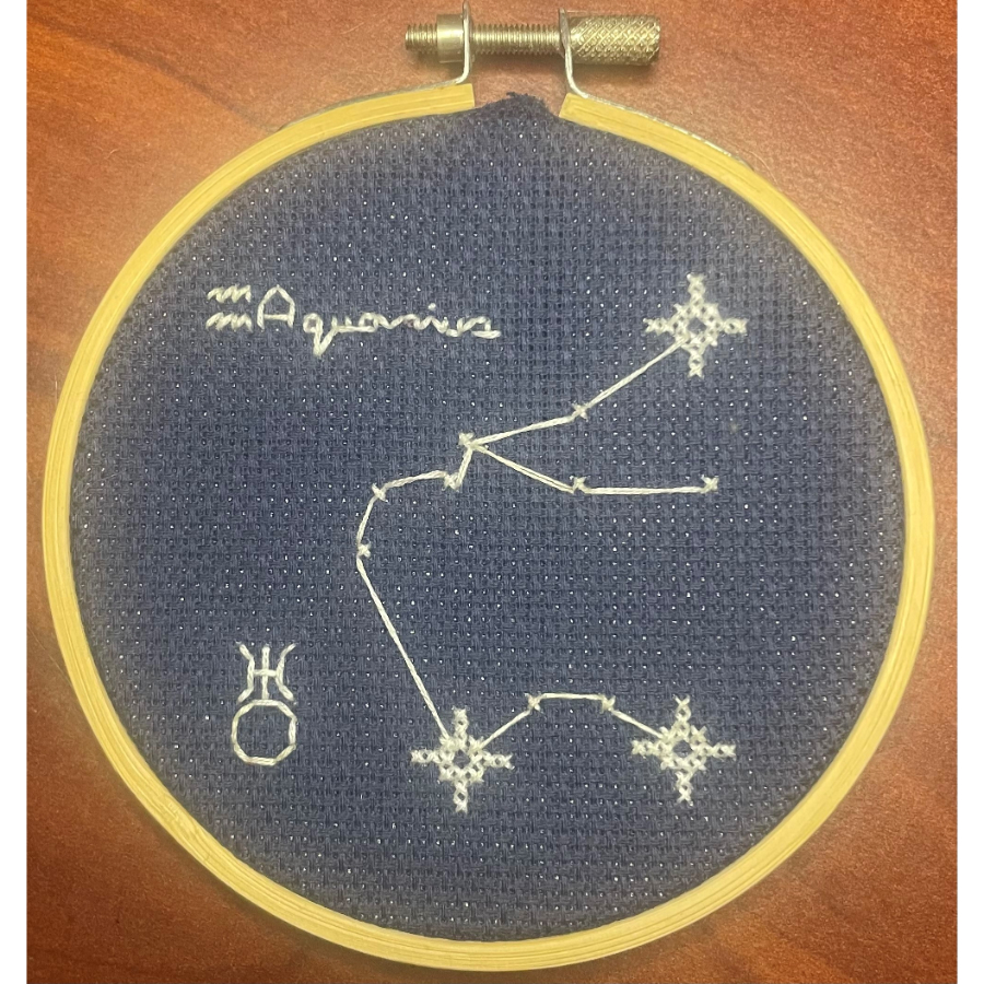 This petite embroidery features the Aquarius constellation stitched in fine white DMC floss against deep navy Aida cloth, capturing a celestial moment with clean, minimal detail. The careful placement of stars and flowing lines evokes the clarity of a night sky, while the stitched astrological symbol adds a personal, astute touch. Neatly framed in a 4-inch wooden hoop, it offers a quiet nod to the cosmos perfect for small spaces or thoughtful gifting.