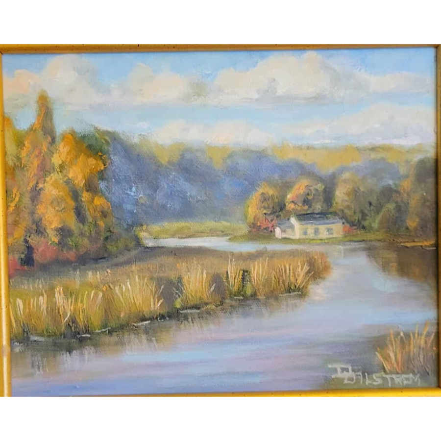 This oil on canvas painting radiates warmth and texture, its surface alive with brushstrokes that highlight the natural beauty of the scene. The depth of color and movement invites the viewer to step closer, allowing the details to unfold without the interruption of glass or matte. Finished in a substantial black and gold wood frame with a 3-inch face and 2-inch depth, the presentation gives the work a bold, elegant presence.