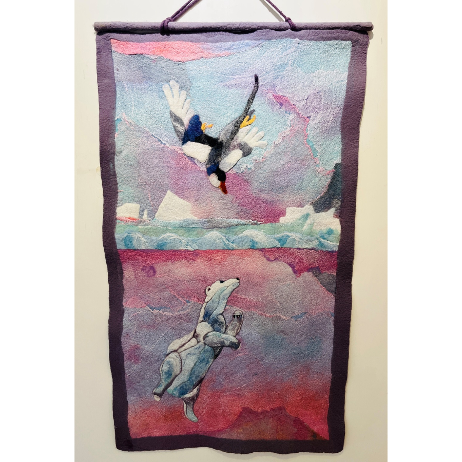 Crafted from fine Merino wool and hand-dyed silk gauze, this hanging artwork captures a vivid polar scene where sky and sea mirror one another in dreamlike hues. A bird dives through an arctic sky while below, a polar bear swims upward, both suspended in a surreal, reflective moment. Mounted on driftwood, the piece flows with natural softness and quiet tension, offering a meditative glimpse into the delicate rhythms of the wild.