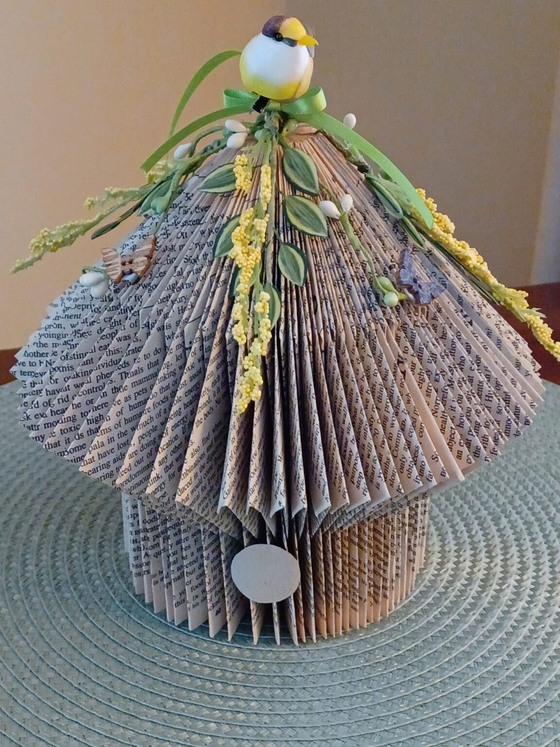 This whimsical sculptural piece is fashioned from folded book pages and embellished with artificial flowers and leaves, wooden butterflies, a clip-on bird, and ribbon, creating the charm of a fanciful birdhouse in bloom. The layered paper construction gives it wonderful texture and dimension, while the soft greens, yellows, and natural page tones lend it a light, garden-inspired presence. A delightful choice for a collector drawn to literary-inspired décor and handcrafted paper art, it brings warmth, imagination, and a cheerful decorative touch to a shelf or tabletop.