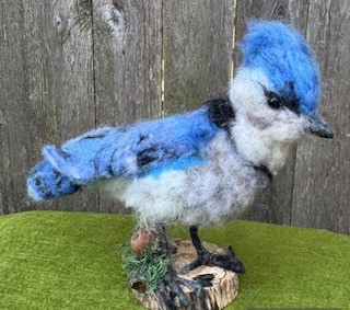 Needle-felted wool blue bird, wire, on fixed wood base.