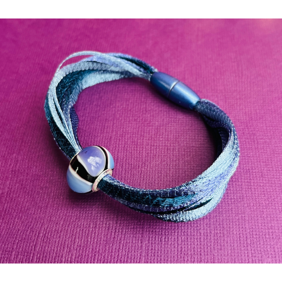 Blue and purple striped Murano glass bead. Wirelace woven ribbon. Magnetic clasp. 7 1/2 x 1/2 in/
