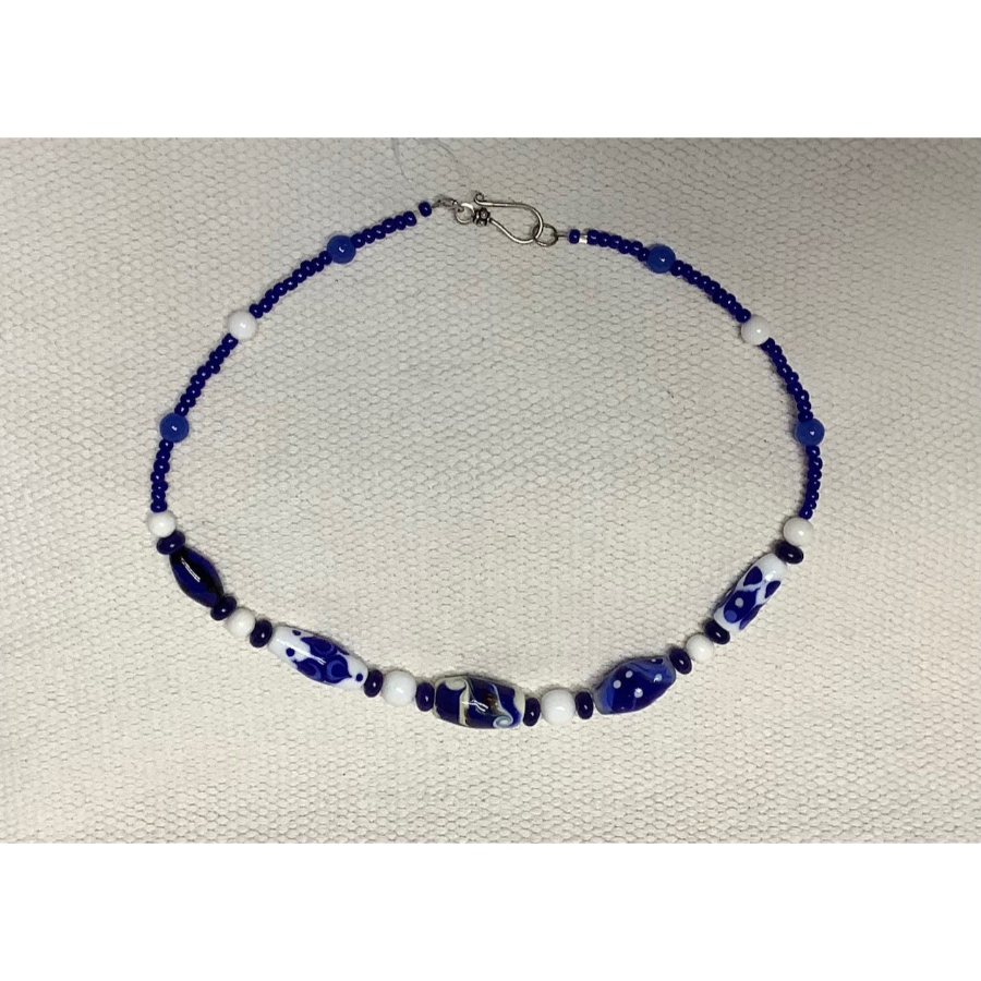 Lampwork, glass and semi-precious beads on 19 1/2 in. stainless steel cable. Sterling silver hook and loop clasp.