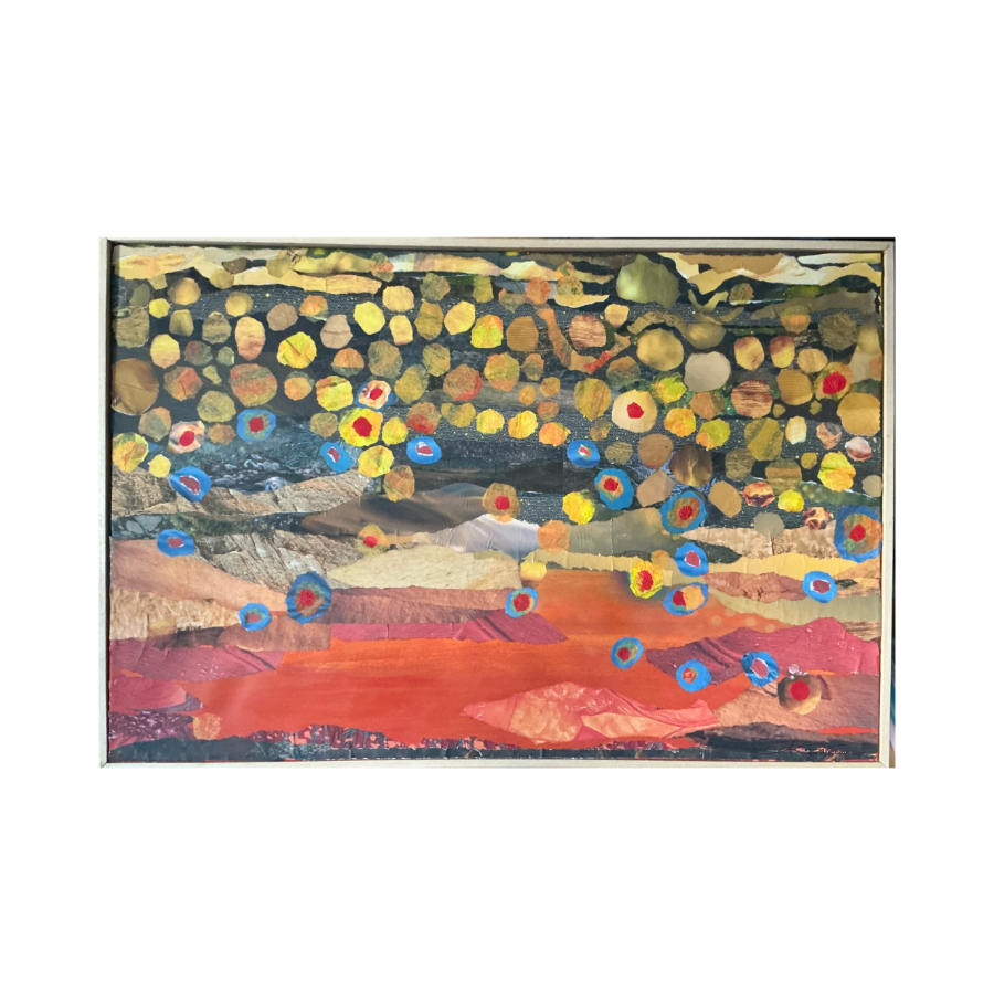 Made with acrylic painted and torn papers on canvas, this 20 x 30 in. work layers vivid color and hand-shaped forms into a richly textured composition that feels both atmospheric and meticulously constructed. Floating clusters of gold, blue, and red move across the surface like luminous fragments suspended over a radiant landscape, giving the piece a sense of rhythm and discovery that will appeal to a collector drawn to bold collage and intricate surface detail. Finished in an ash wood floater frame with a poly finish and a 1/2 in. face, it has a clean contemporary presentation that beautifully complements its handcrafted depth and visual energy.