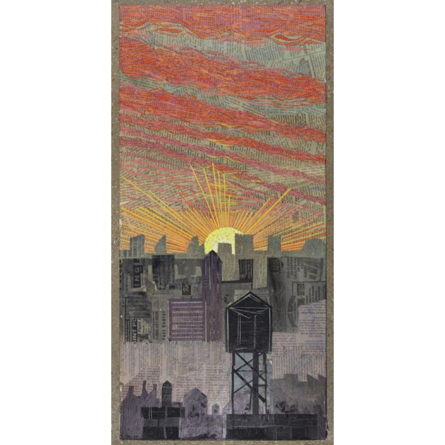 Created with tinted newsprint cut and applied to stretched canvas, this 15 x 36 in. work captures an urban skyline at day’s end with remarkable texture, pattern, and atmosphere. Layers of antique newspaper lend the surface a sense of history and quiet complexity, while the radiant sky and silhouetted architecture give the piece a dramatic yet nostalgic presence that would resonate with a collector drawn to cityscapes and inventive paper-based construction. Its long vertical format makes it especially compelling above a sofa, console, or mantel, where its graphic rhythm and warm glow can unfold across the room.