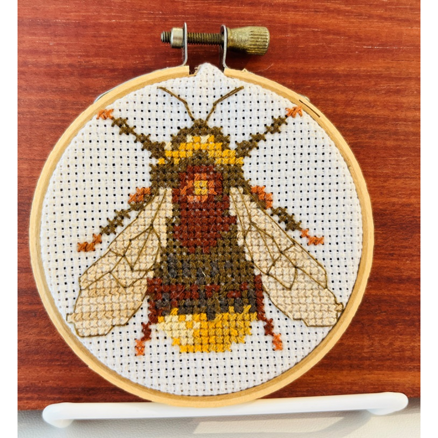 Compact and full of character, this 3-inch embroidery captures a bee in warm shades of DMC floss, expertly stitched on crisp white Aida cloth. Each tiny cross-stitch forms the delicate details of wings, legs, and fuzzy texture, bringing lifelike charm to this miniature study of nature. Nestled within a petite wooden hoop, it offers a cheerful and intricate nod to the natural world.