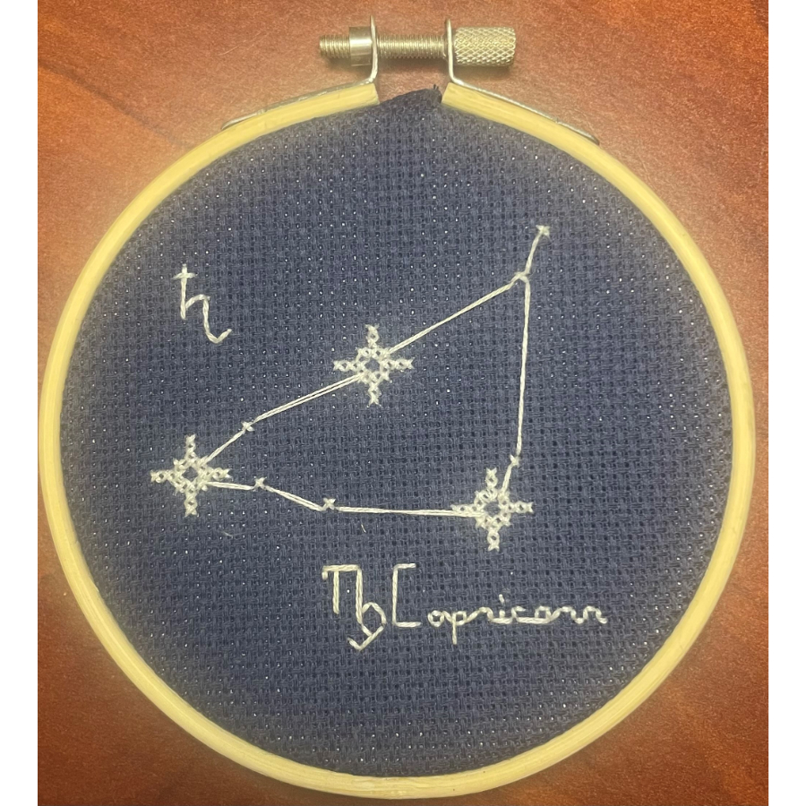 This celestial embroidery features the Capricorn constellation, delicately stitched in white DMC floss on a rich navy Aida cloth backdrop. The fine detailing includes the zodiac symbol and name, offering a balanced blend of starry geometry and personal expression. Housed in a 4-inch wooden hoop, it’s a charming handcrafted piece that celebrates the steady, grounded nature of this earth sign.