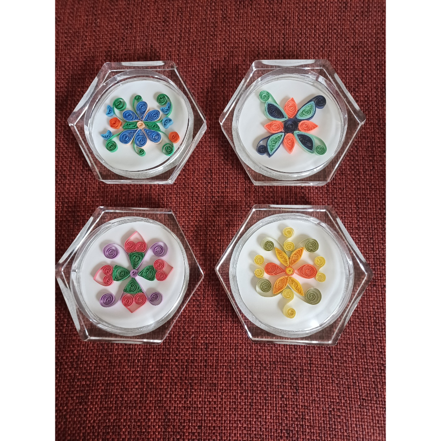 Acid free 1/8 in. quilling paper, acid free cardstock, encased in clear acrylic, with felt backing. Set of 4.