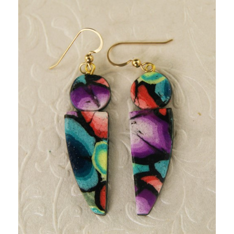 Polymer clay, resin, gold-filled earwires. Earring drop is 1 3/4 in.
