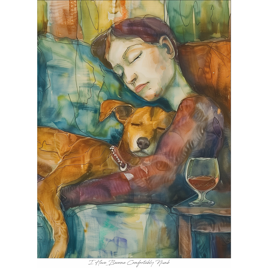 This archival pigment print captures a quiet, intimate moment between a woman and her sleeping dog, their forms melting together in fluid washes of color and softly sketched lines. Printed with pigment inks on acid-free paper and presented in a black aluminum frame with archival white mat, it offers the warmth of watercolor with the precision of digital artistry. Its tender composition invites the viewer into a peaceful pause, where time seems to slow and comfort becomes its own beautiful escape.