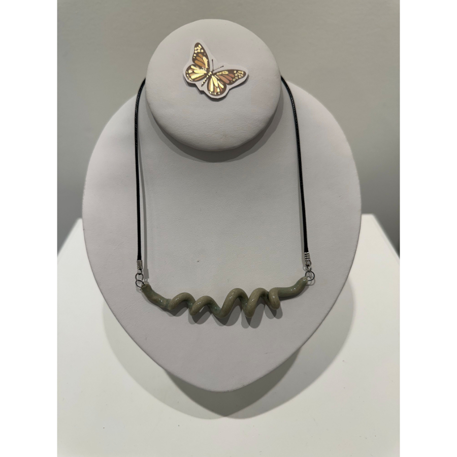 Ceramic on black cord, base metal lobster clasp. Pendant is 11 in. long.