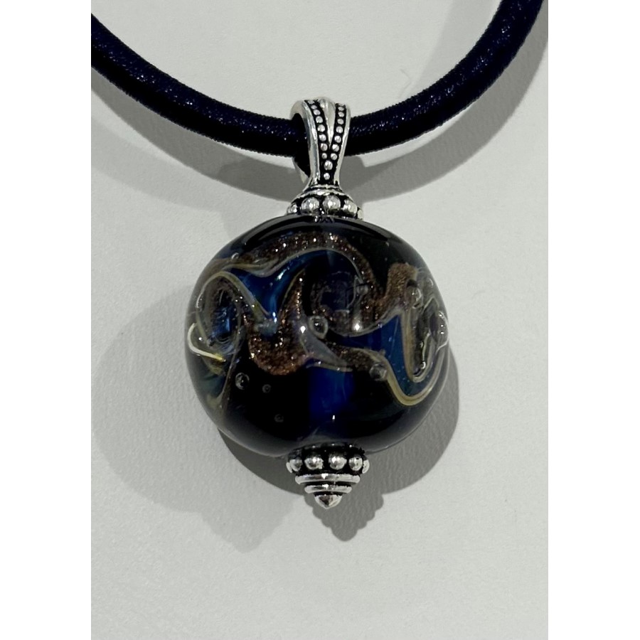 Lampwork bead with silvertone antiqued pewter bail, cap. 18 inch satin wrapped cord.