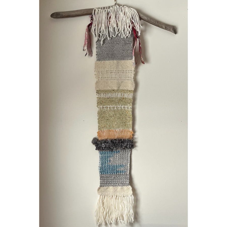 This handwoven fiber piece combines wool, linen, cotton, roving, acrylic threads, and yarns in a long vertical composition full of subtle texture and quiet tonal variation. Measuring 41 1/2 inches high by 8 inches wide and suspended from a 24-inch driftwood hanger, it layers soft neutrals with gentle touches of blue, blush, and gray, creating a work that feels both organic and thoughtfully balanced. A beautiful choice for a collector drawn to contemporary textile art, it brings warmth, texture, and a calm natural presence to a wall.