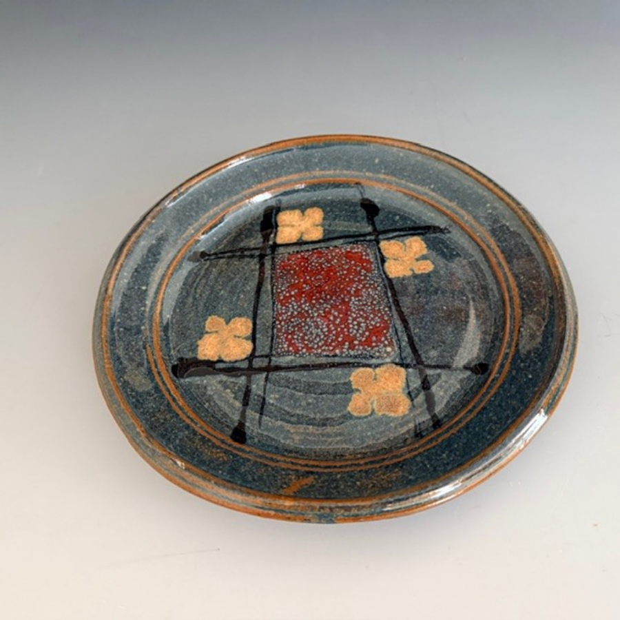 Stoneware with Iris blue glaze, and lines and stamps. Watertight, food, microwave, dishwasher safe.