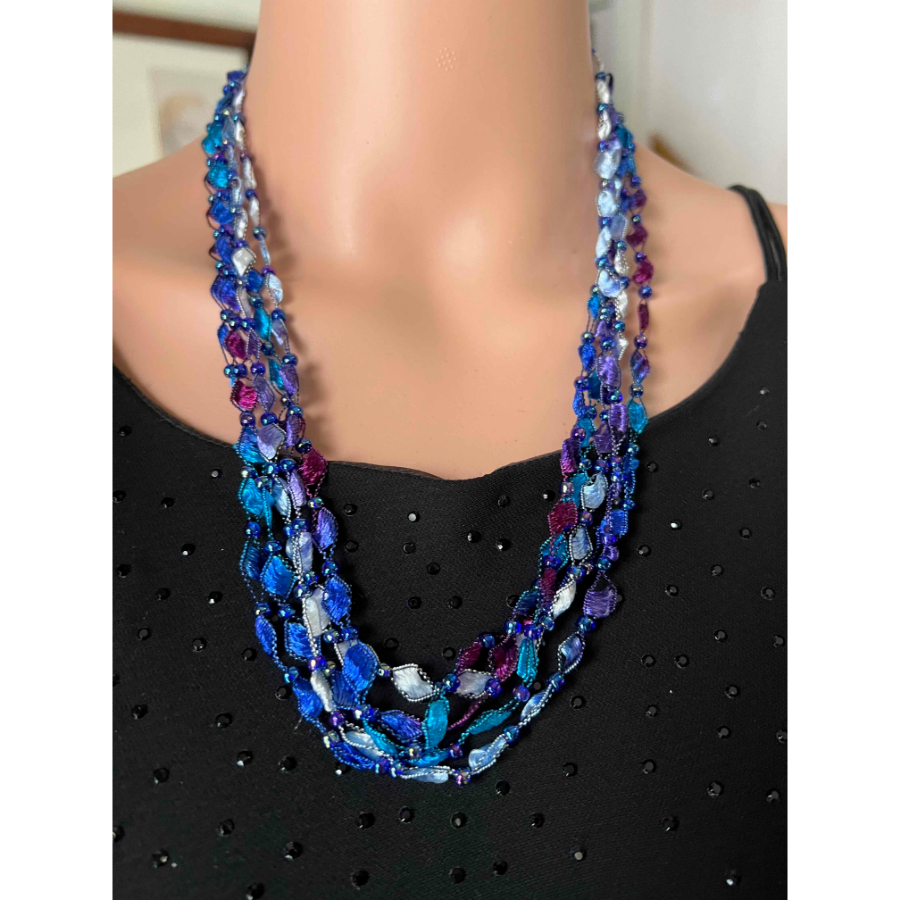 Nylon ribbon yarn, glass beads. Approximately 24 in. long, silver-tone magnetic clasp.