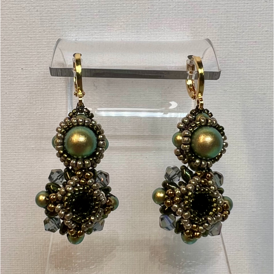 Swarovski pearls and crystals, Miyuki and Toho seed beads. Gold- plated earwire. Earring drop: 1 1/2 in.