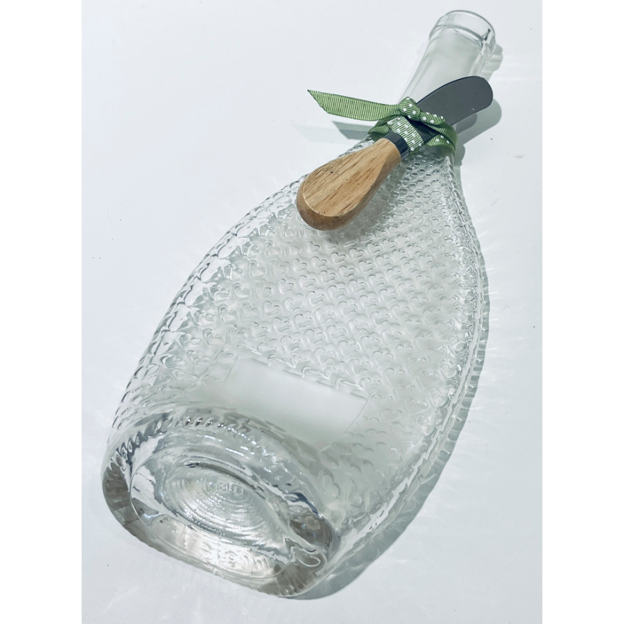 Slumped glass, ribbon, and cheese knife. Food safe, watertight. 11 in. long, 4 in. wide. Handwash.