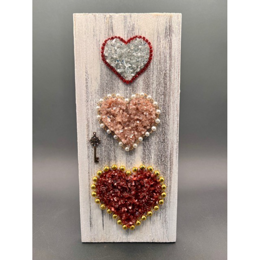 Shells, crushed glass, pearls, and and rhinestones on wood panel.