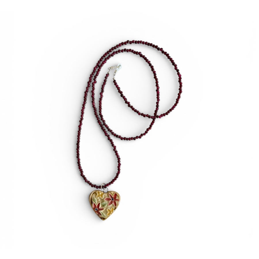 Garnet, ceramic hand-made pendant on 32 in. chain. Sterling hook & eye clasp.