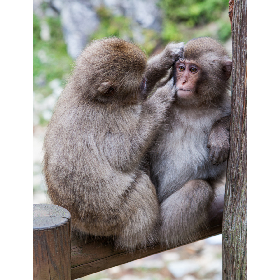 This fine art photograph captures a tender, unguarded moment between two monkeys, where a simple gesture becomes an expression of care and connection. The soft focus background and natural textures draw attention to the intimacy of the interaction, highlighting emotion through posture and eye contact rather than action. Finished in a matte black frame with brushed gold trim, archival white mat, and non-reflective glass, the presentation adds a quiet elegance that complements the warmth of the scene.