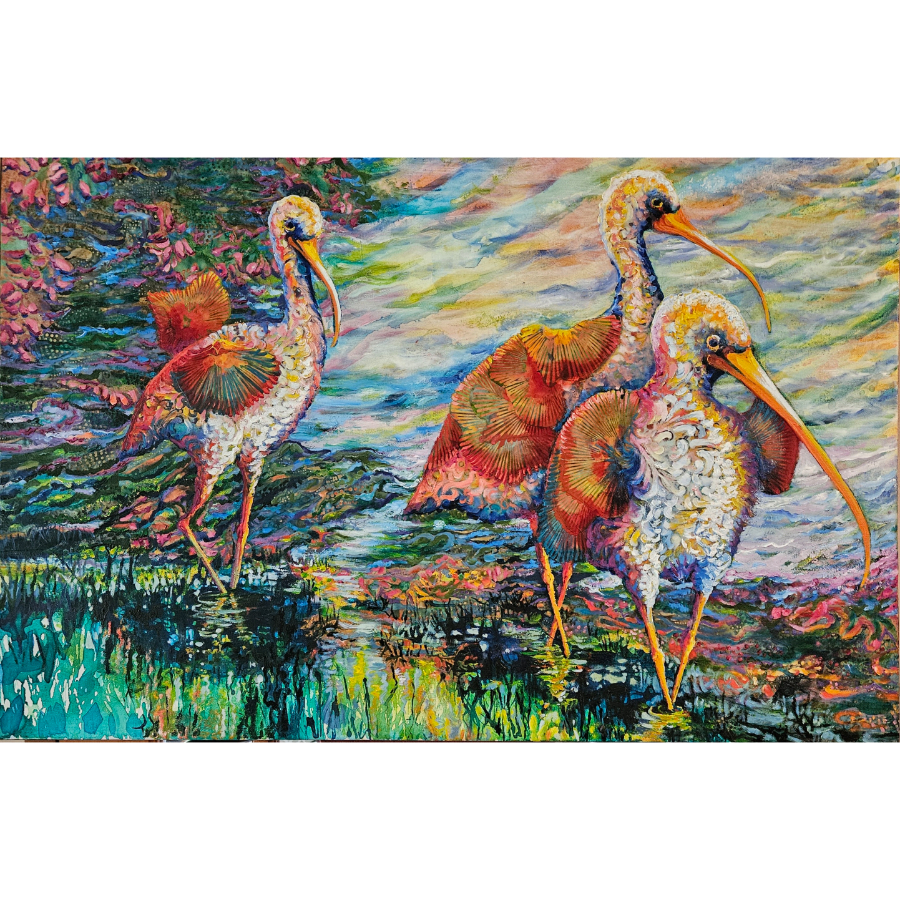 A vibrant journey into a dreamlike wetland, this 24 x 36 inch mixed media canvas combines quilted fabric elements with expressive acrylic and oil painting. Three ibises, rendered with intricate textures and saturated hues, step gracefully through reflective shallows under a sky rippling with color. The sides of the canvas are painted for a finished, frameless presentation perfect for those who appreciate bold storytelling through textile and brush.