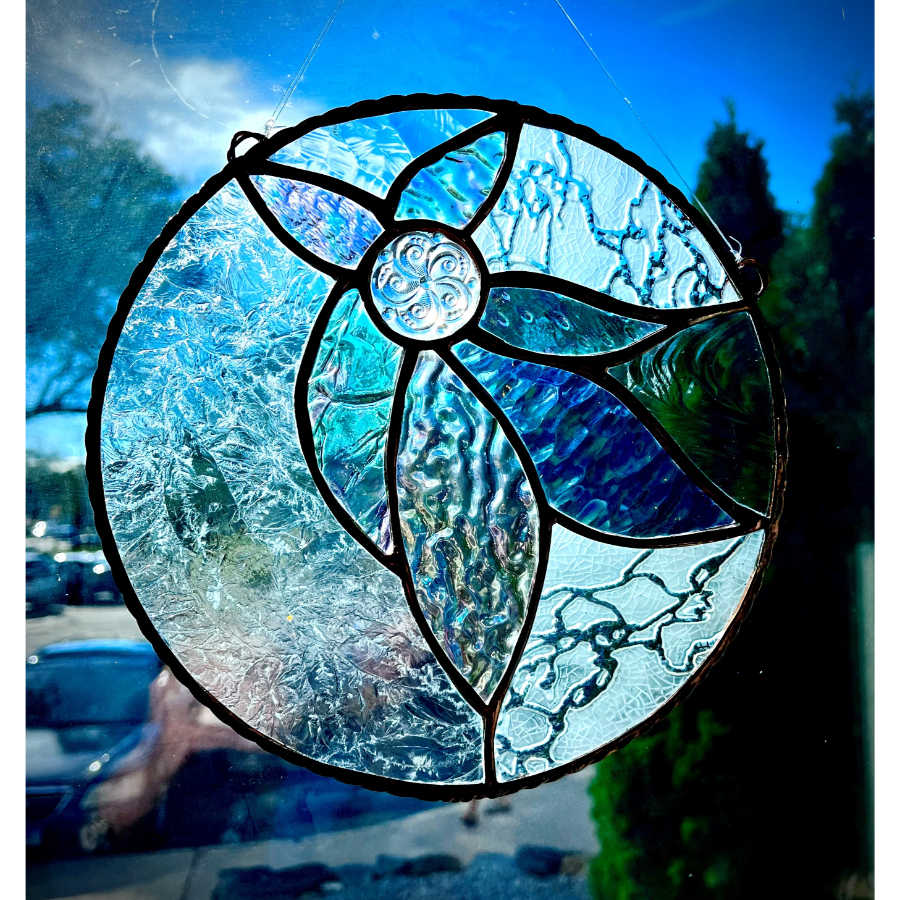 Clear iridescent textured glass with flower swirl glass jewel. 8 in. round.