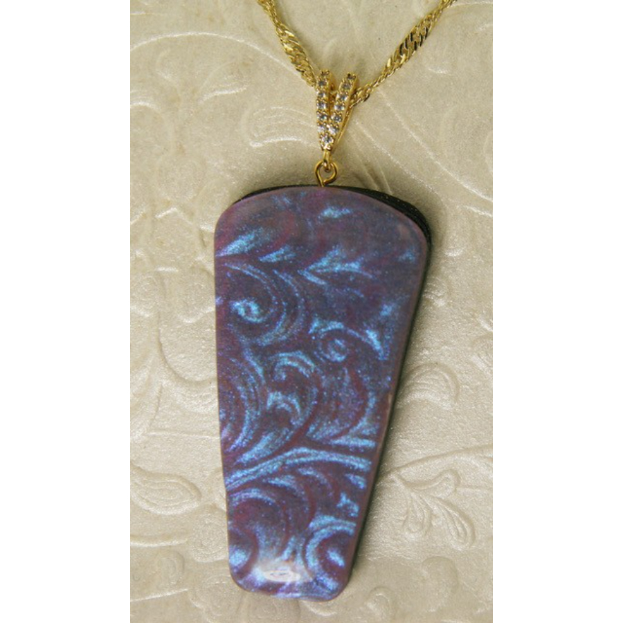 Polymer clay, mica powder, resin, cubic zirconia bail, adjustable Singapore 18-19 in. chain. 2 in. pendant.