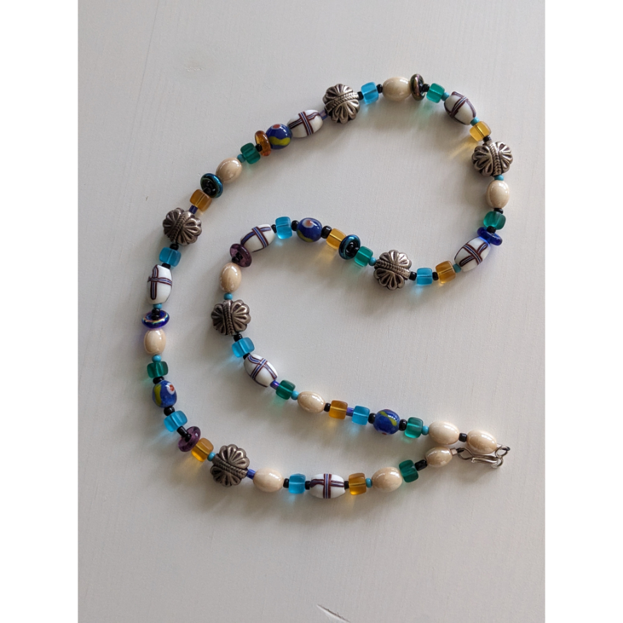 Assorted glass and silver beads, on 23 in. beading wire, Sterling silver hook and eye clasp.