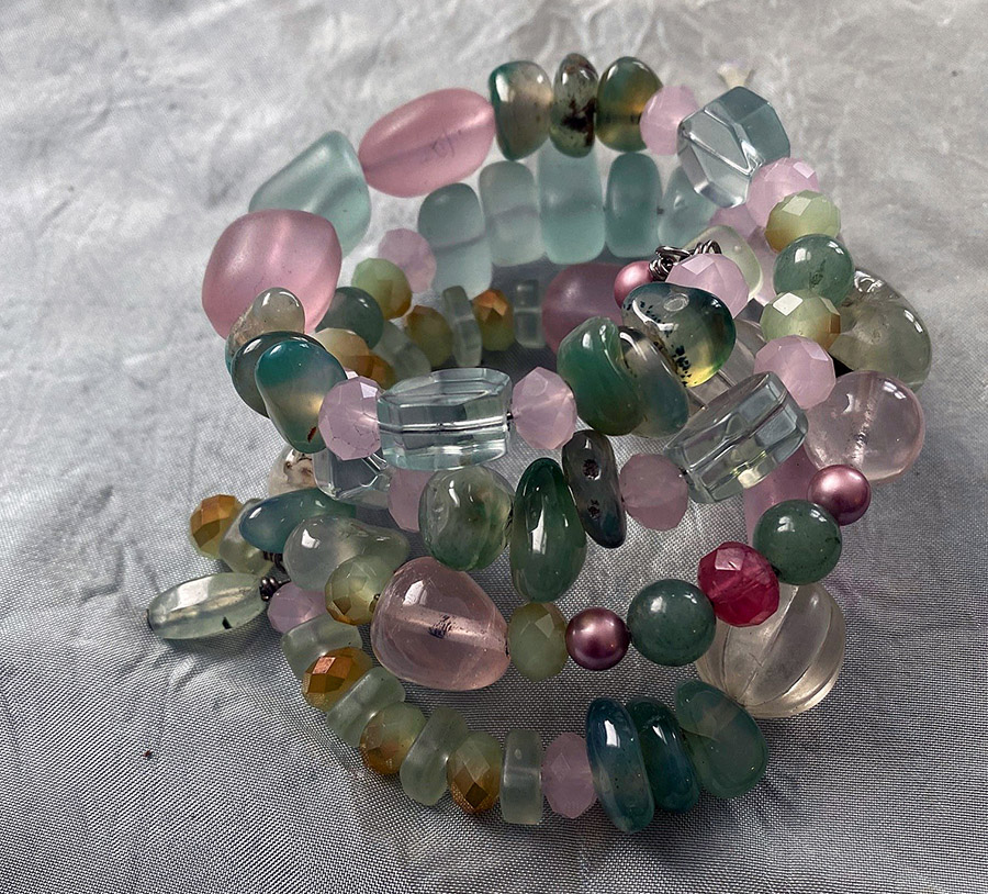 Semi-precious stones, sea glass, vintage lucite beads. Bracelet wraps 3 x around on wrist.