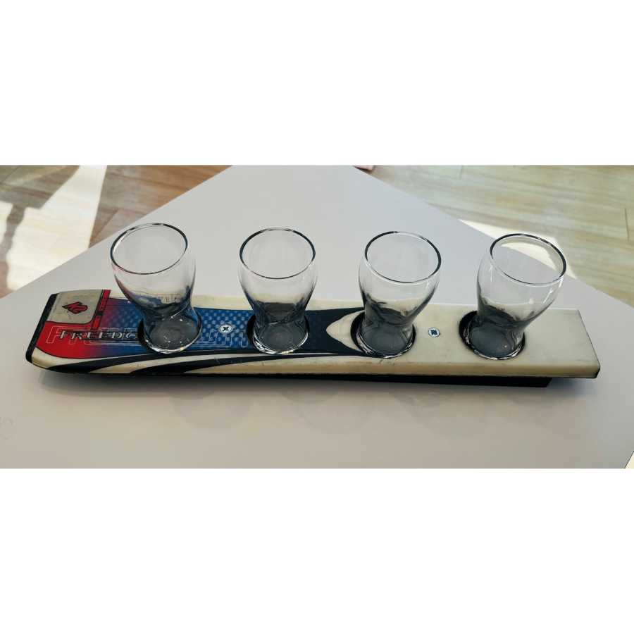 Recycled skis and four 5 oz. mini pub glasses. In Gallery pick up only.