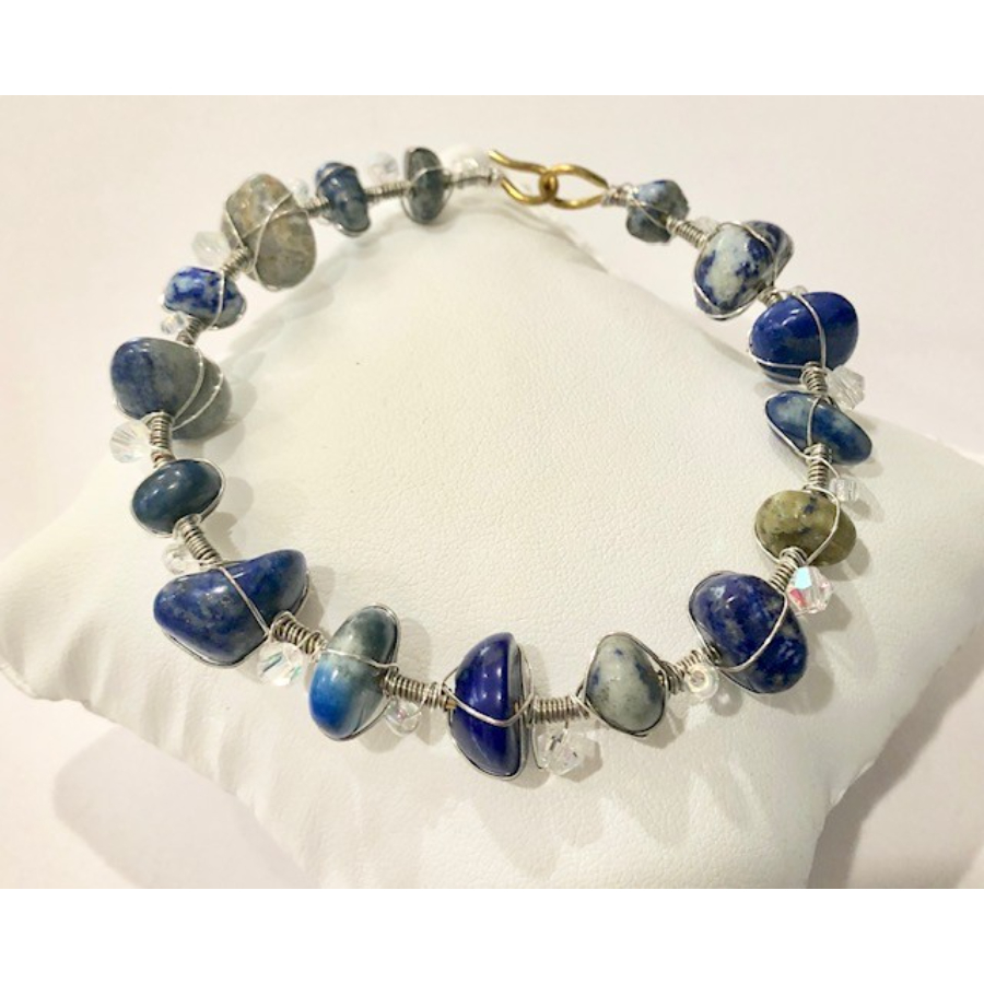 Lapis Lazuli, crystals and anti- tarnish silver-plated wire and Jeweler’s gold wire. 7 1/2 in.