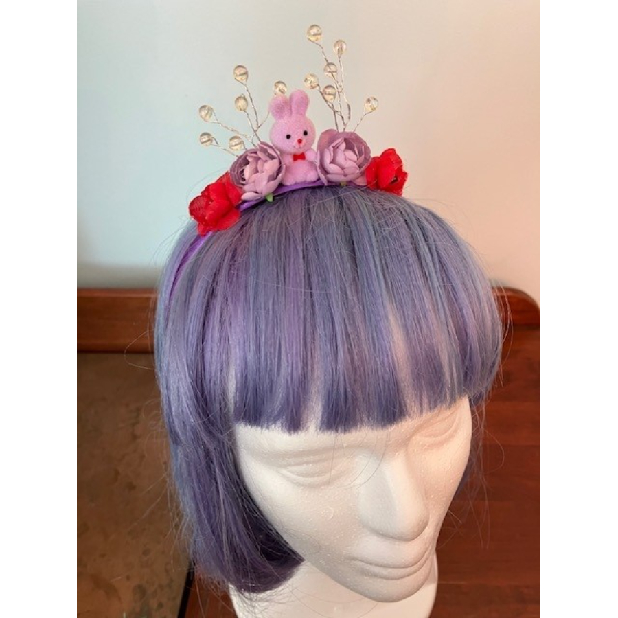 Headband made with satin, with bunny and roses ephemra.