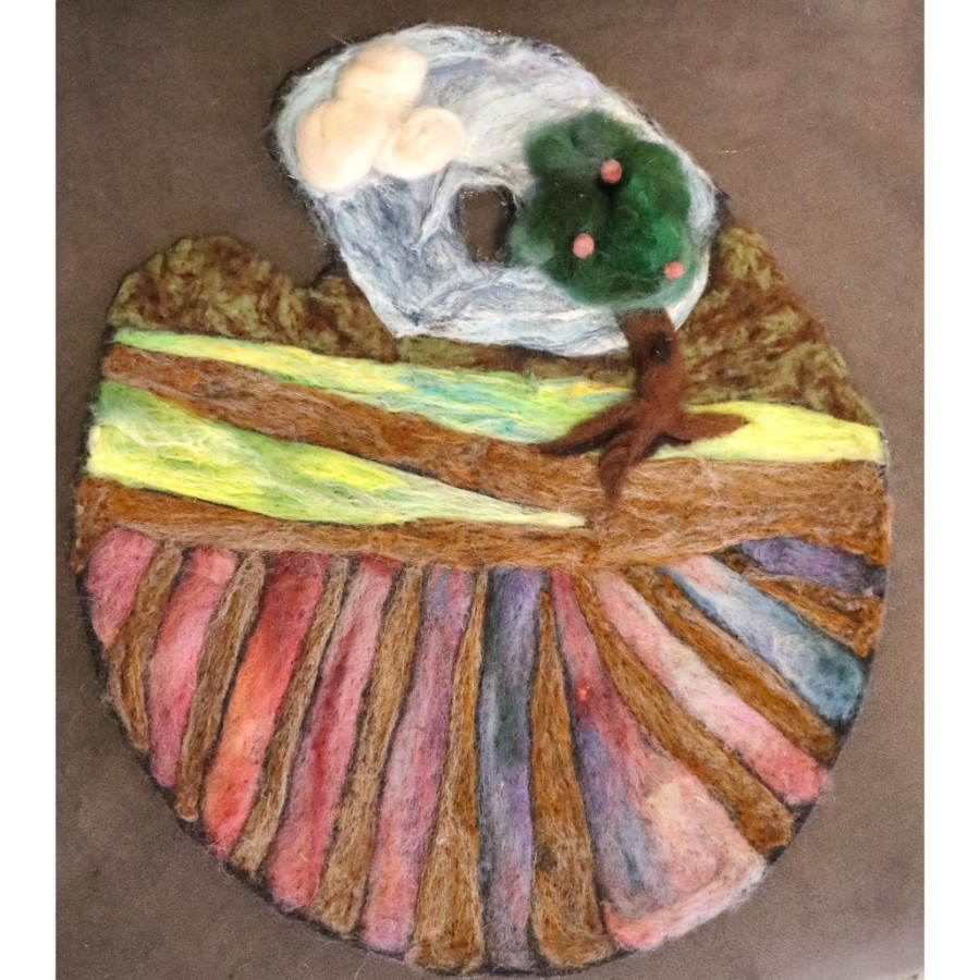 Shaped on a wooden artist’s palette, this tactile landscape is crafted from felted wool and roving felt, blending natural texture with vivid color. Rolling fields in lavender, ochre, and green stretch beneath a swirling sky, with a rooted tree anchoring the composition in warmth and whimsy. At 18.5 x 15.5 inches, the piece transforms a painter’s tool into a dimensional tribute to earth, sky, and creative expression.