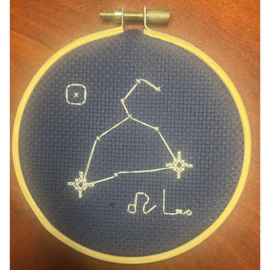 This handcrafted 4-inch embroidery celebrates the Leo constellation, rendered in delicate white DMC floss against a dark navy Aida cloth backdrop. Featuring bold star points, clean linework, and the Leo symbol and name, it captures the regal presence and confidence associated with this fire sign. Neatly framed in a wooden hoop, it’s a celestial accent with a strong yet refined personality.