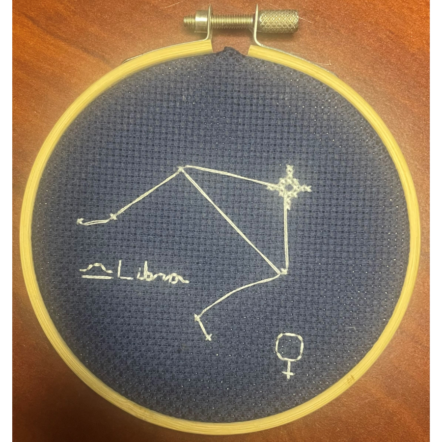 Gracefully stitched on navy Aida cloth, this 4-inch embroidery captures the Libra constellation in fine white DMC floss, with clean lines and subtle star accents. The zodiac name and symbol, paired with the planetary glyph, create a delicate balance of celestial and symbolic design. Framed in a wooden hoop, it offers a thoughtful nod to harmony, beauty, and the stars above.