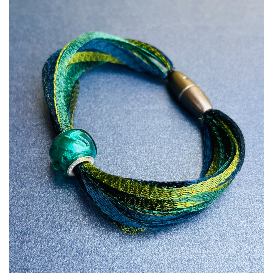 Murano glass bead dots verde with sterling silver wirelace ribbon. Magnetic clasp. 7 1/2 x 1/2 in/