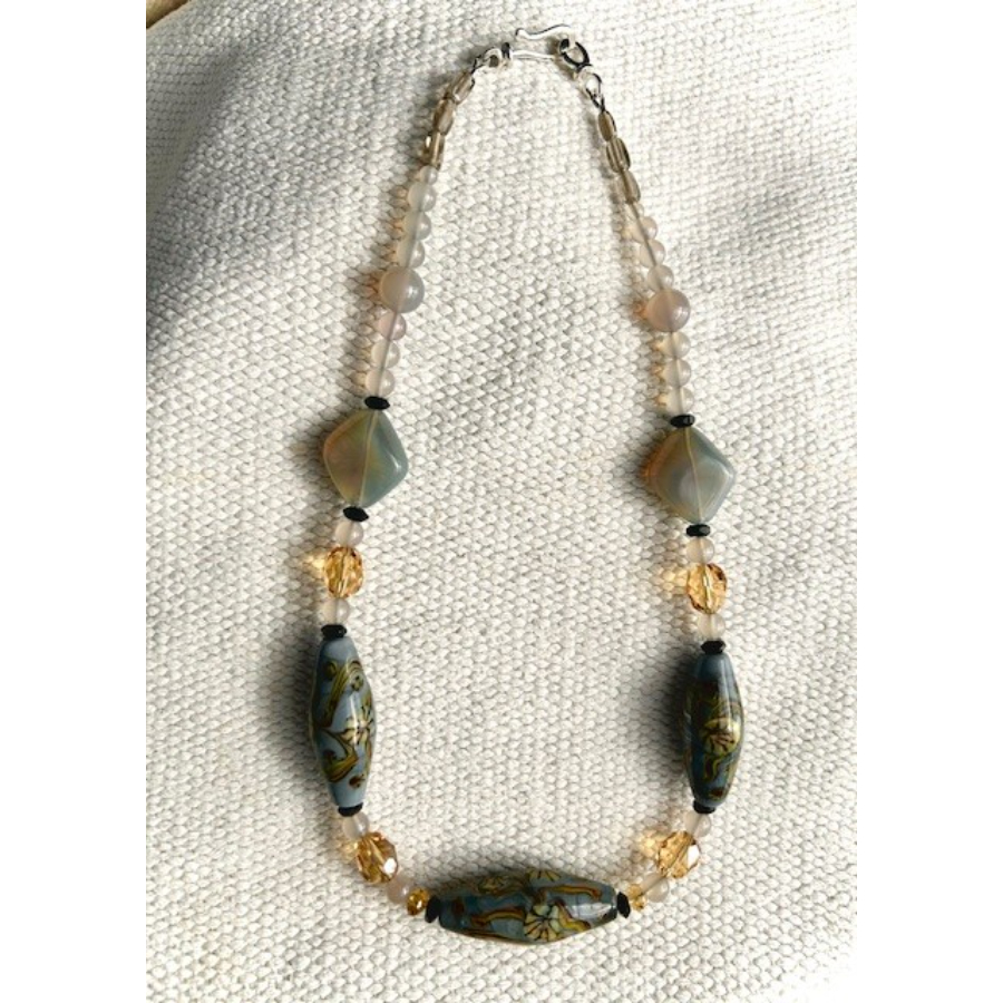 Lampwork beads, semi-precious stone beads, Czech glass beads. 20 in. stainless steel cable. Sterling hook and loop.