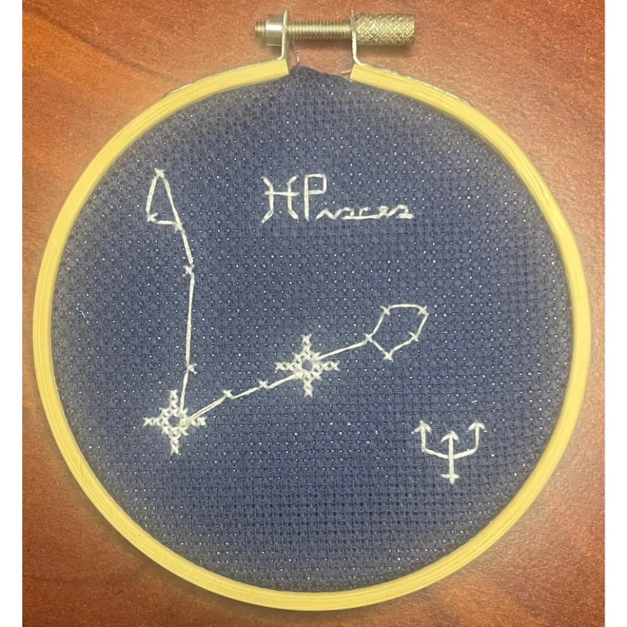 This 4-inch embroidery captures the flowing form of the Pisces constellation, delicately rendered in white DMC floss on deep navy Aida cloth. The design includes the zodiac’s name and symbol, along with a stitched trident, evoking the intuitive and fluid nature of this water sign. Neatly enclosed in a wooden hoop, it’s a dreamy, handcrafted tribute to the stars and the mysticism they hold.