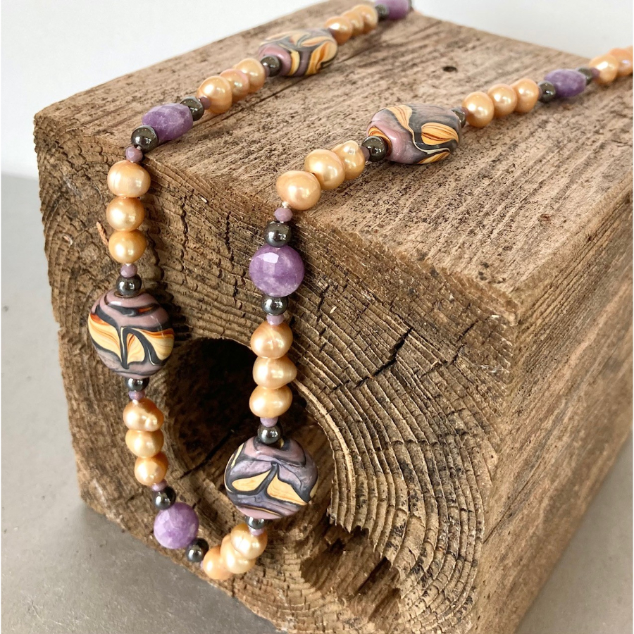 Lampwork Glass beads, Pearls, Lepidolite, Hemitite, strung on 21 1/4 in. silk chain. J-Hook and figure 8 Sterling silver clasp