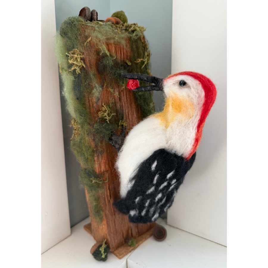 This sculptural woodland scene is crafted from mixed felted wool with a found wool bird perched on a wood log, a bright red berry held delicately in its beak for a touch of vivid contrast. The soft, hand-worked fibers and natural wood create a beautifully textured piece that brings the quiet charm of the outdoors into the home, while its three-dimensional form gives it warmth and personality from every angle. A distinctive addition for a collector drawn to nature-inspired work and tactile detail, it measures 13 x 10 inches.