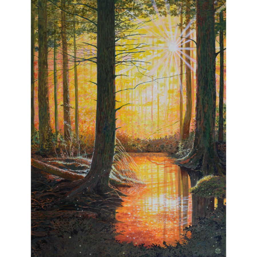 This oil on canvas painting draws the viewer into a quiet woodland where sunlight streams through towering trees, casting a golden glow across a reflective stream. The interplay of light and shadow creates depth and atmosphere, evoking both mystery and warmth in the secluded forest scene. Framed in a black wood floater with a silver stripe, 1-inch face, and 1-inch depth, the work measures 25.5 inches high by 19.5 inches wide, offering a luminous focal point for any space.