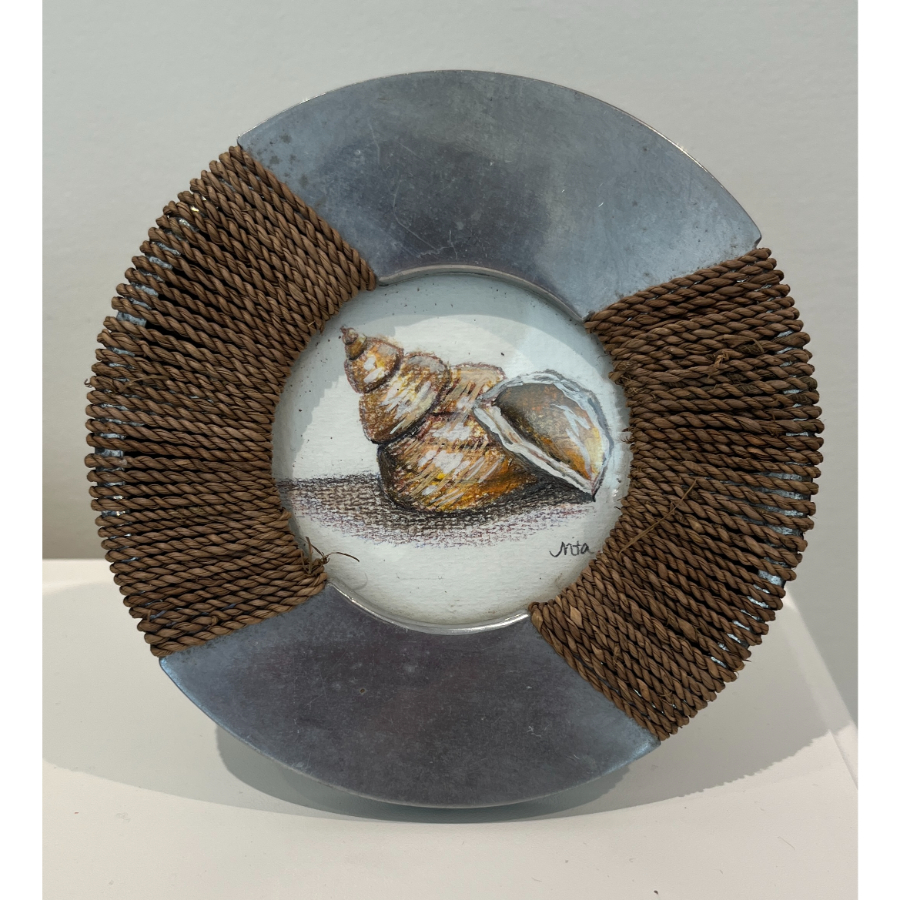 Colored pencil, ink and paint on pressed paper. Metal and twine frame, 2 in. frame face.