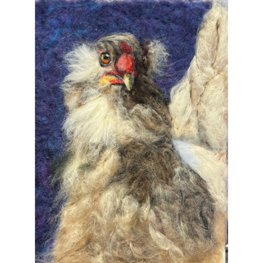 Crafted from sheep’s wool, alpaca fiber, and shimmering silk threads, this 12 x 9 inch fiber painting captures the quiet dignity of a barnyard hen with painterly warmth and expressive depth. Needle felted onto a wool felt backing and framed in a rustic 2-inch face barn-wood frame, the piece blends natural textures with rich visual storytelling. The medium—sheep and alpaca wool with silk fibers on felt—brings a tactile softness and gentle luminosity to this intimate portrayal.
