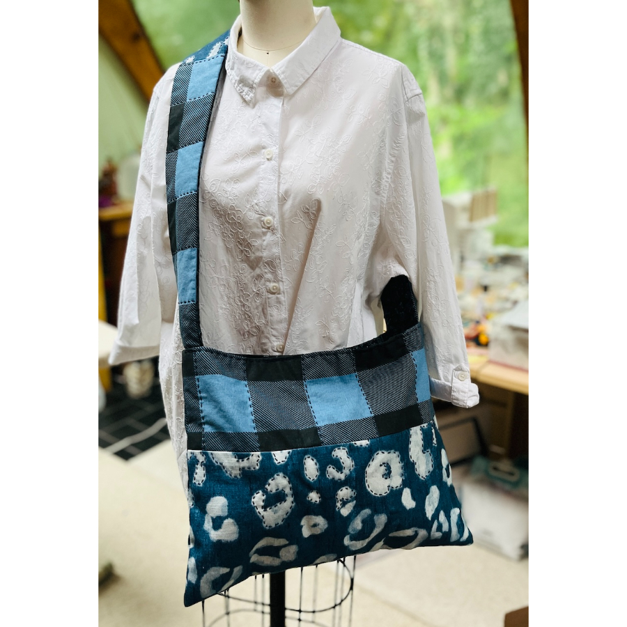 Made of cotton canvas, quilting cotton, Sashiko stitching, with 40 in. strap. Hand wash or spot clean, line dry. 16 x 12 in.