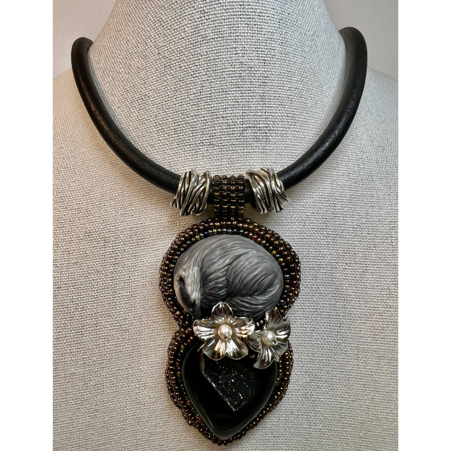 Polymer clay, Miyuki and Toho beads, Onyx, 18 in. leather cord, magnetic stainless steel clasp. 2 x 1 1/2 in pendant.