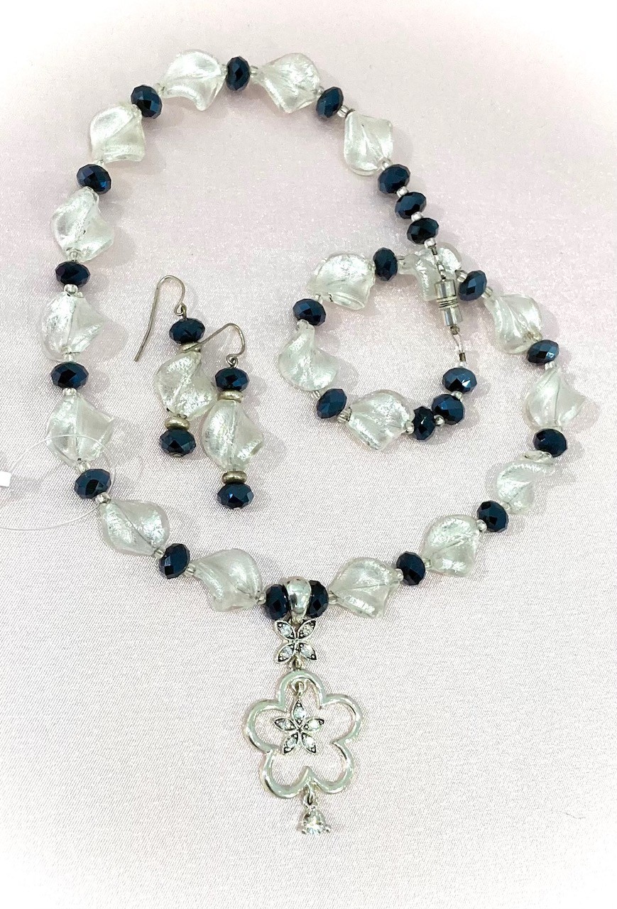 Dichroic and faceted glass beaded necklace and earring set. Magnetic clasp, 3 inch earring drop.