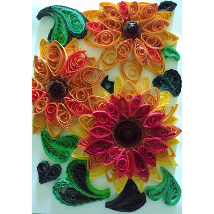 Vibrant loops and coils of pre-cut quill paper form bold floral motifs, each petal shaped with care and layered in radiant shades of red, orange, and yellow. Mounted on Bristol board and secured with white glue, the piece offers dimension and whimsy through its intricate spirals and textured structure. Presented in a black shadow box frame with picture glass, it’s a lively fusion of color and craftsmanship.