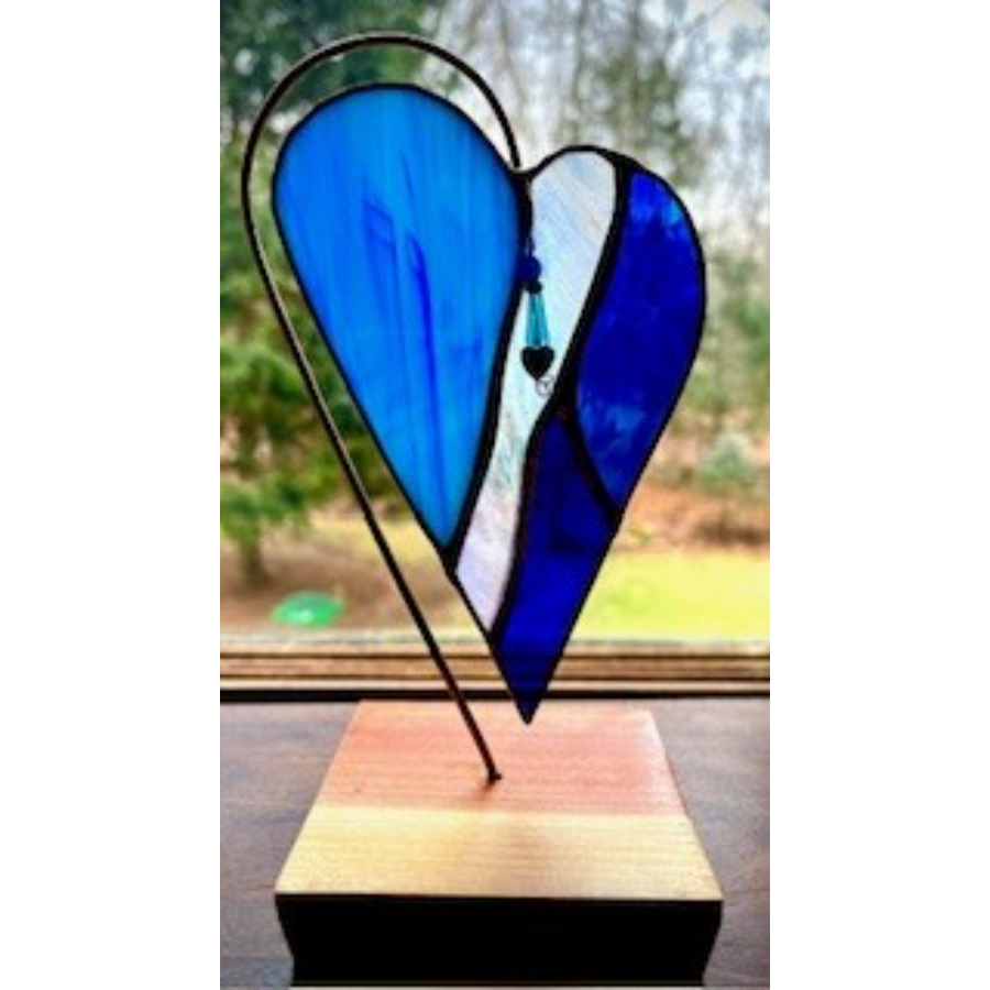Stained glass, copper foil, glass beads, cedar base. 8 x 3 1/2 in.